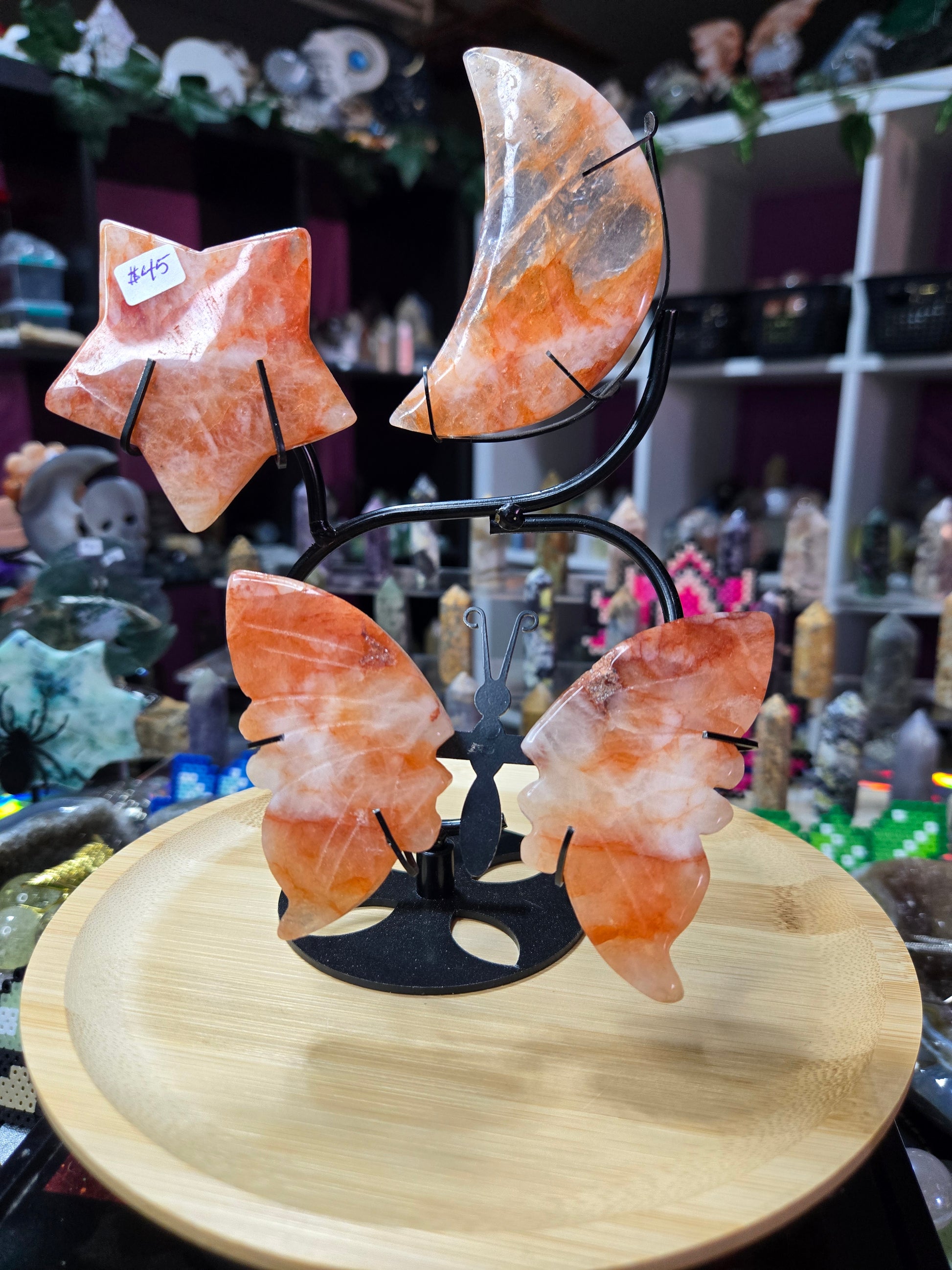 Enhance your space with our Fire Quartz Trio. The set includes a moon, star, and butterfly wings all on a beautiful stand. Each piece is made from fire quartz, known for its grounding and energy amplifying properties. Bring a touch of nature and positive energy to your home.