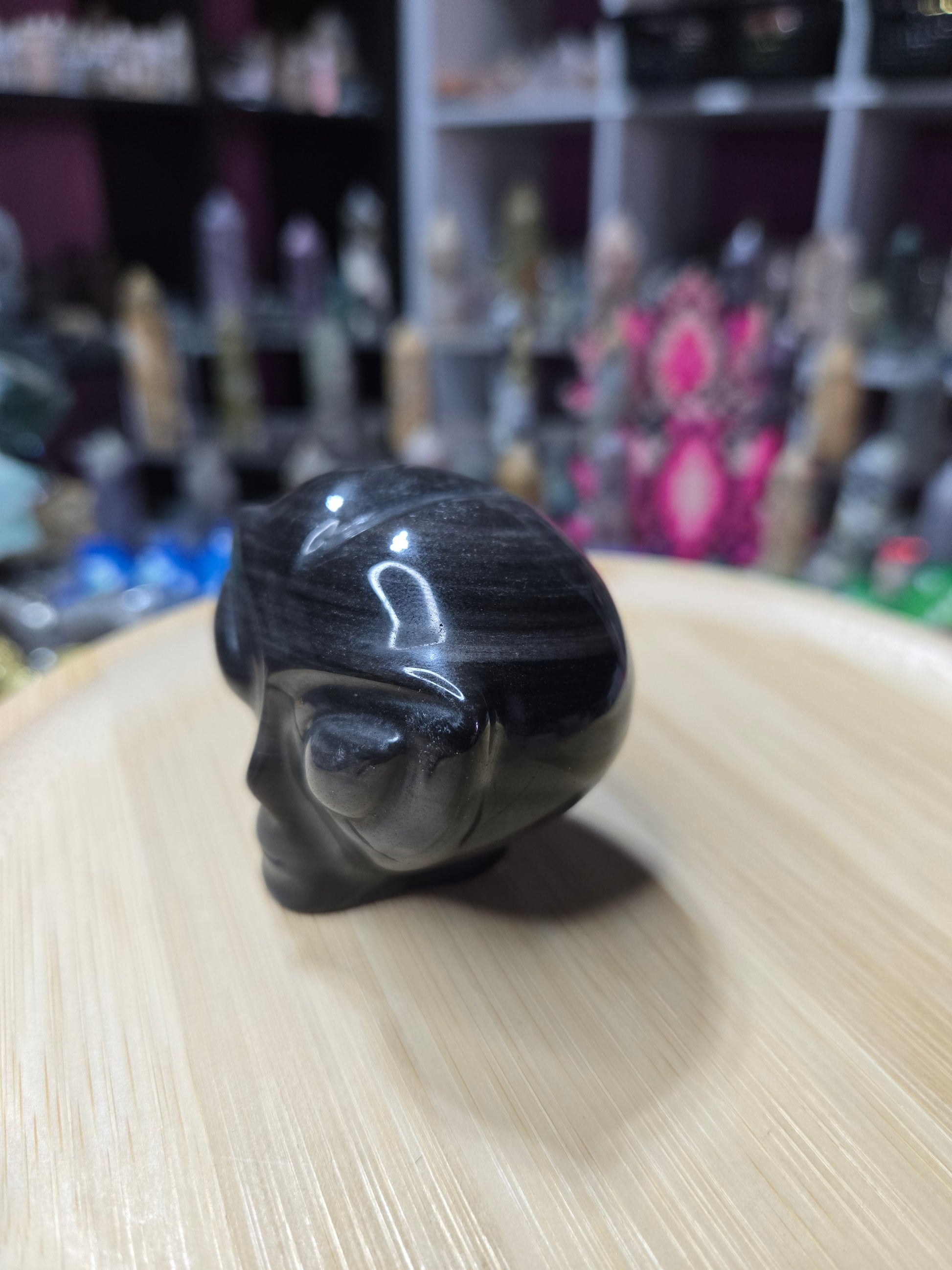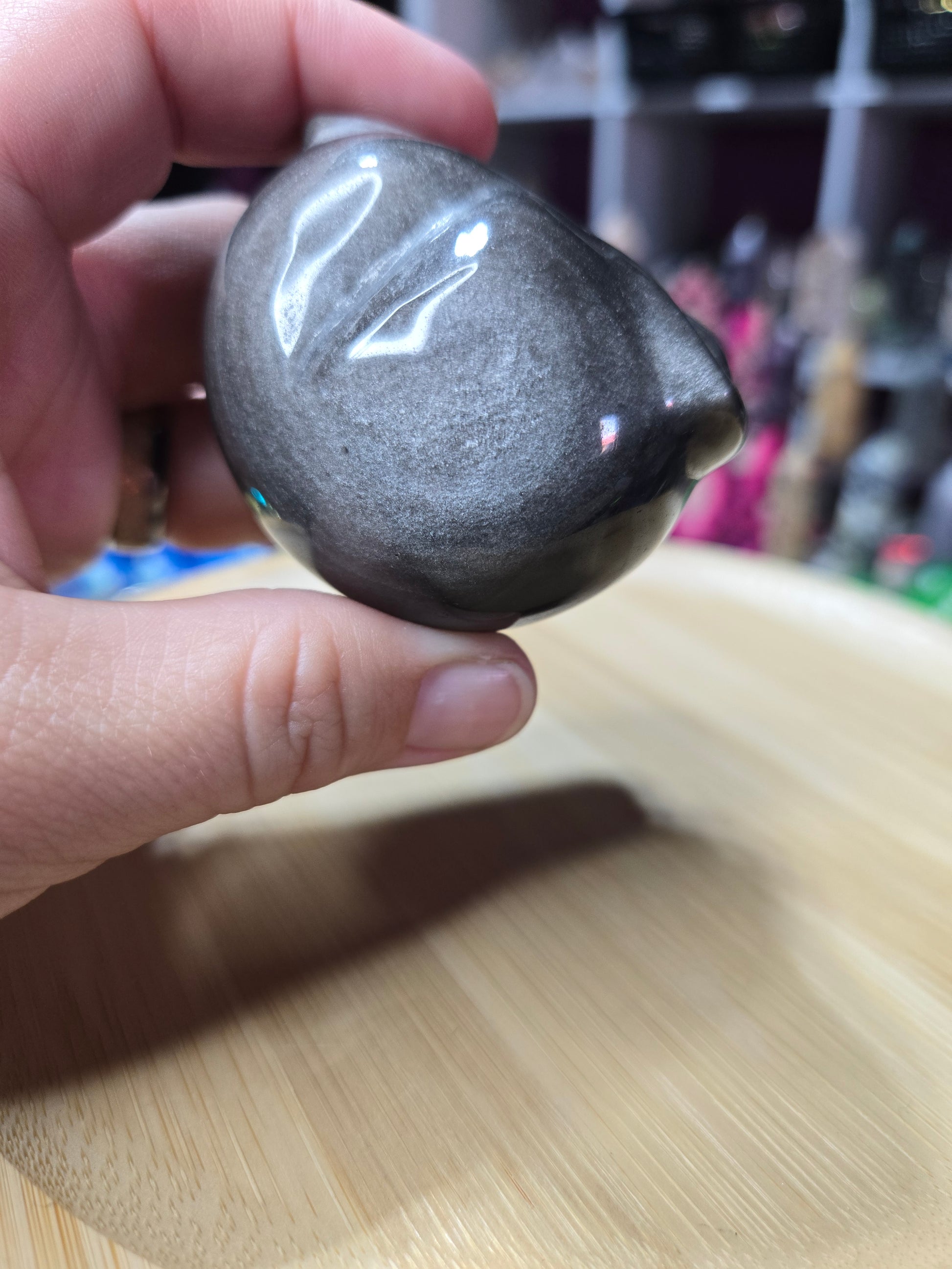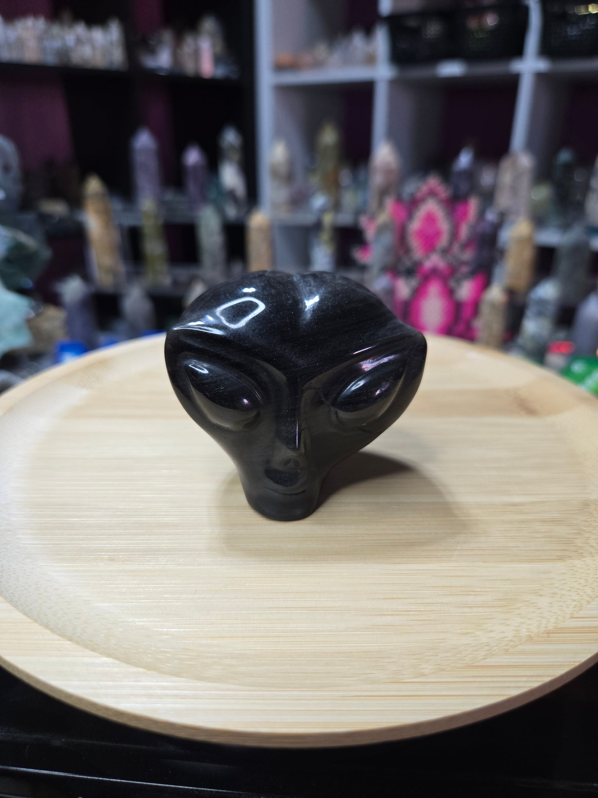 This Silver Sheen Obsidian Alien Head is a unique and eye-catching addition to any collection. Crafted from silver sheen obsidian, known for its striking metallic luster, and intricately carved into an alien head design. Please note, there may be a small chip at the base, adding to the authenticity and character of this piece.