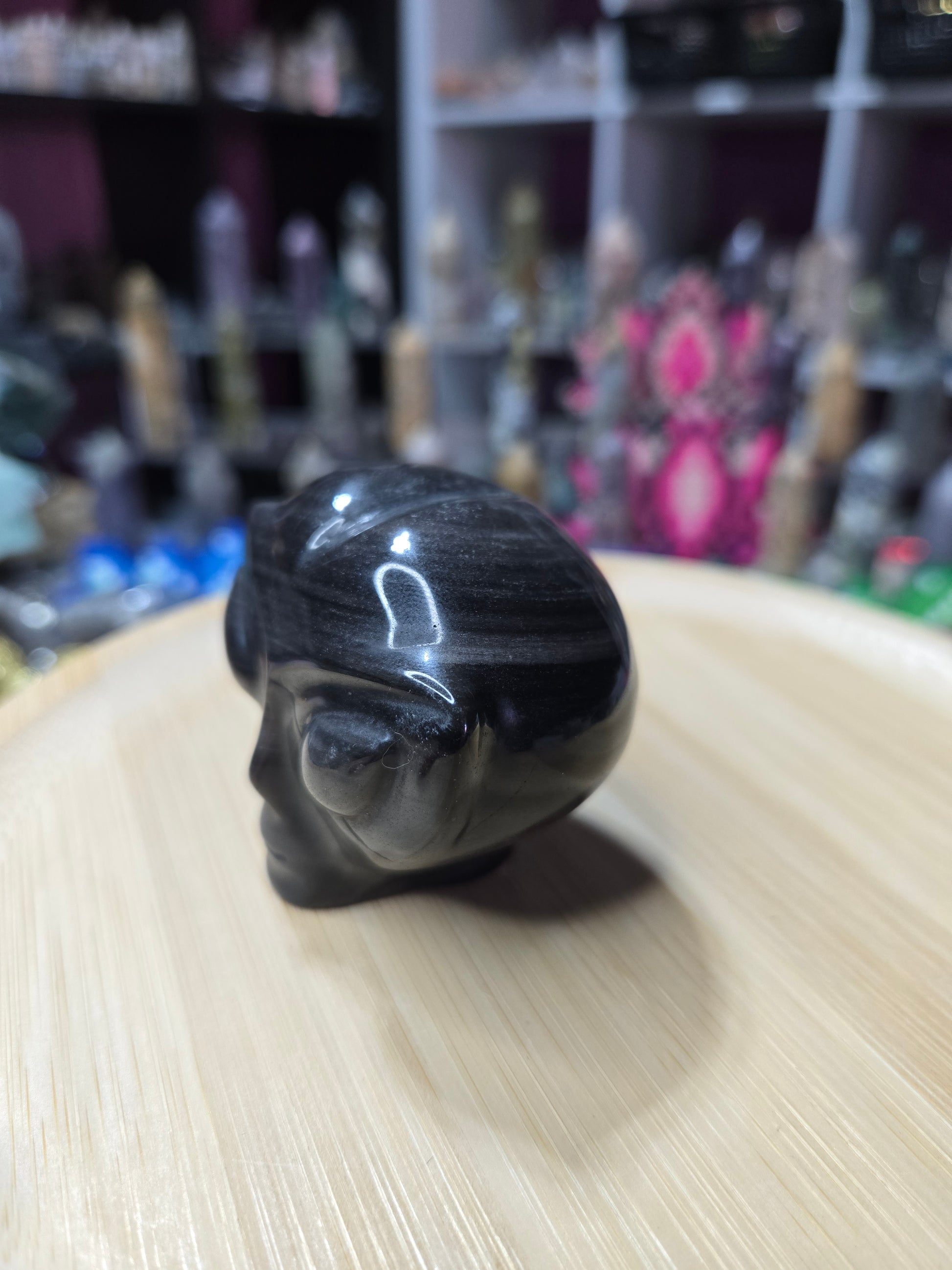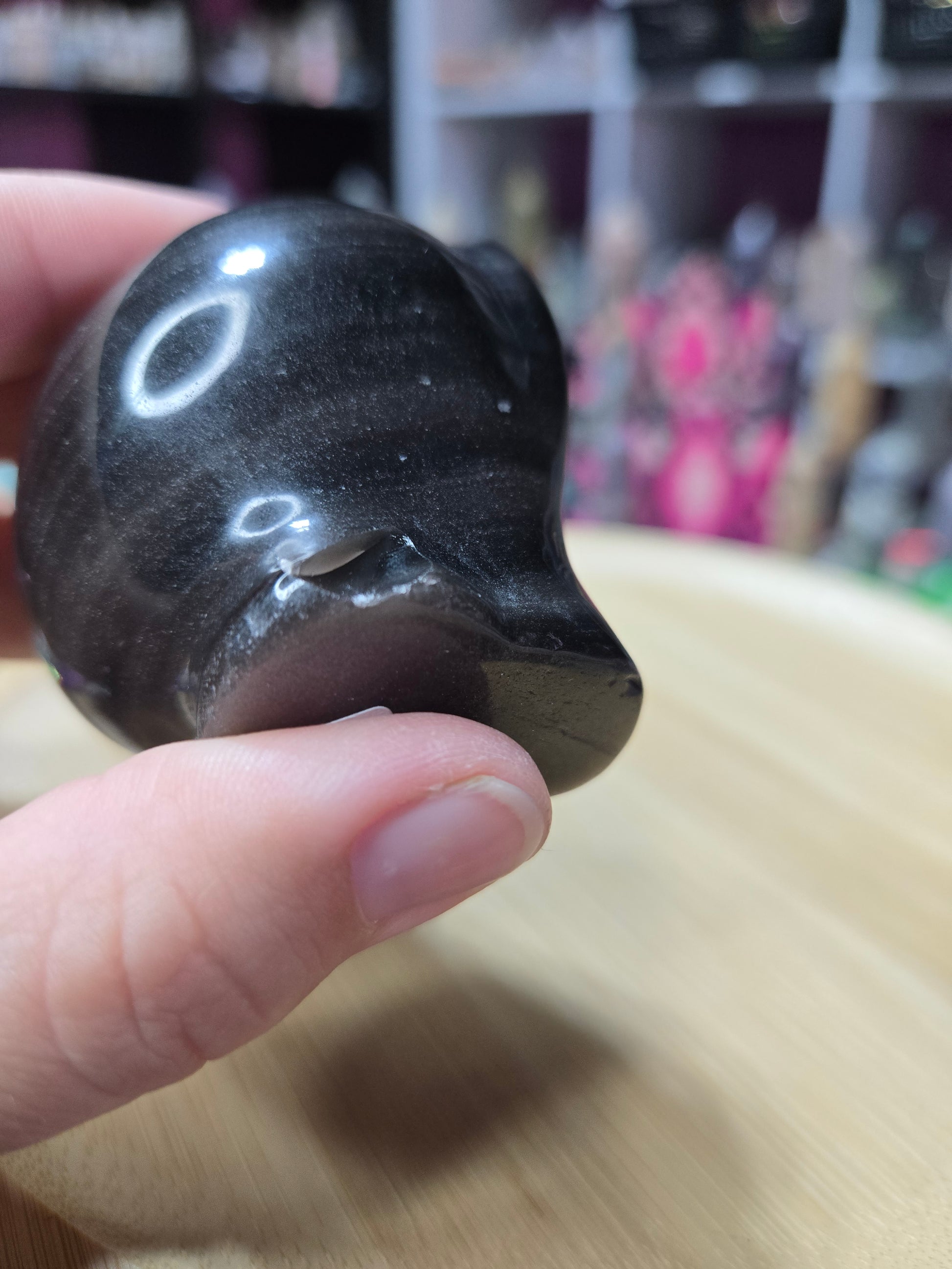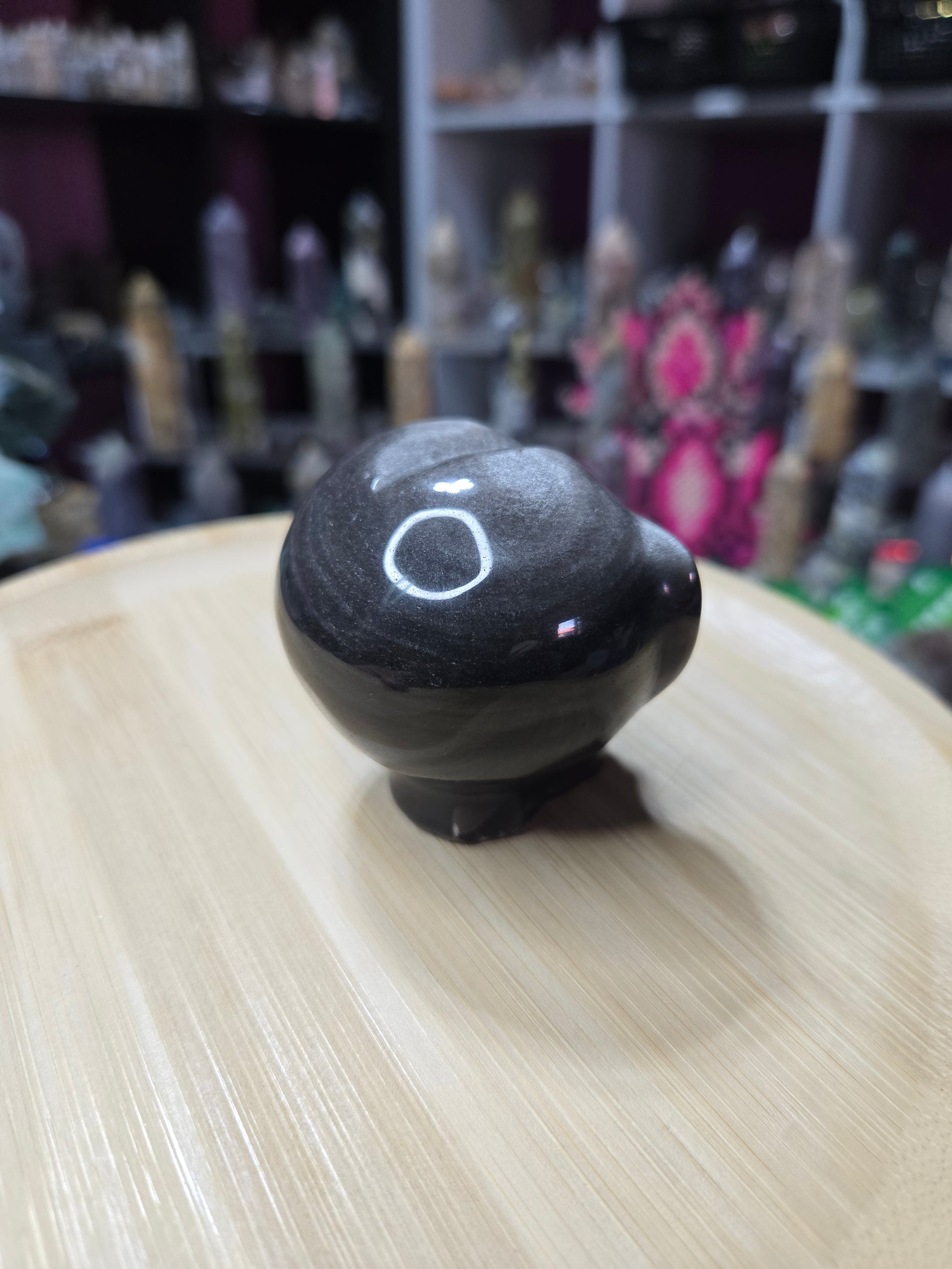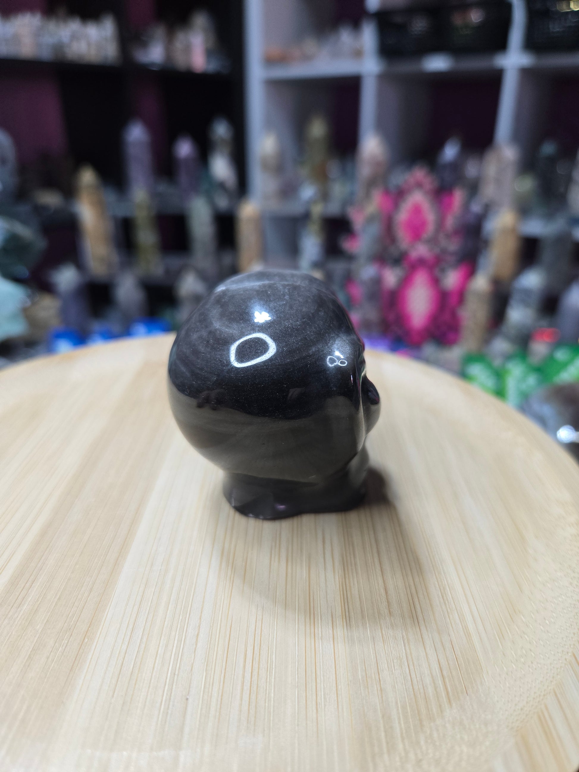 This Silver Sheen Obsidian Alien Head is a unique and eye-catching addition to any collection. Crafted from silver sheen obsidian, known for its striking metallic luster, and intricately carved into an alien head design. Please note, there may be a small chip at the base, adding to the authenticity and character of this piece.