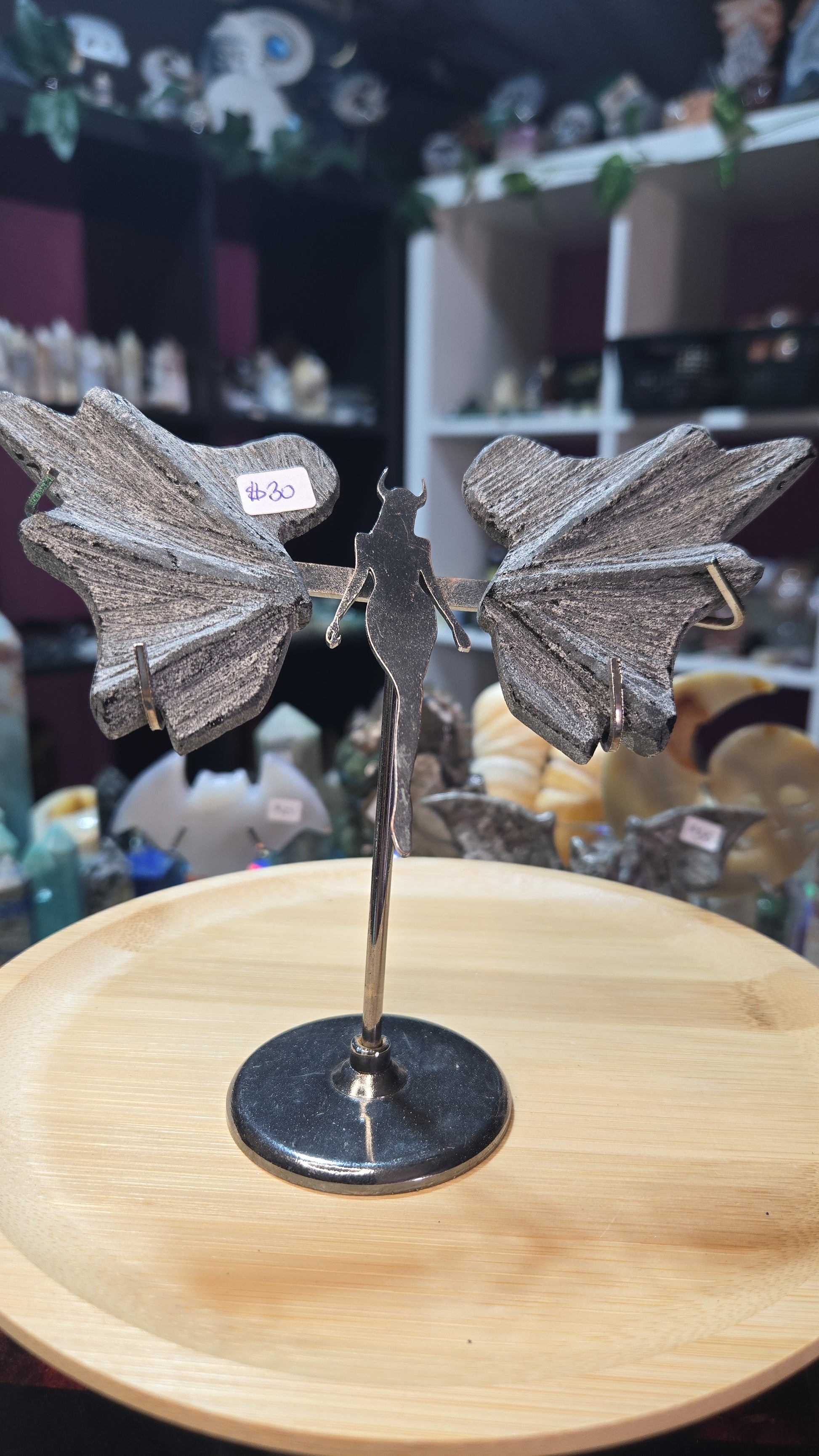 Enhance your home decor with the natural beauty of our Tourmaline Wings. Designed with rough tourmaline carved into the shape of wings, these unique pieces are displayed on a magnificent horned female stand. The dark aesthetic adds a touch of elegance to any room.